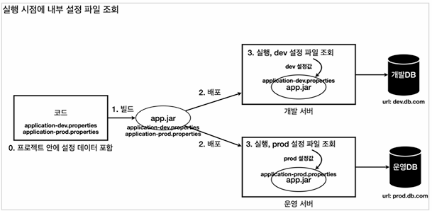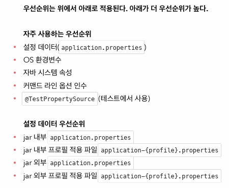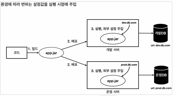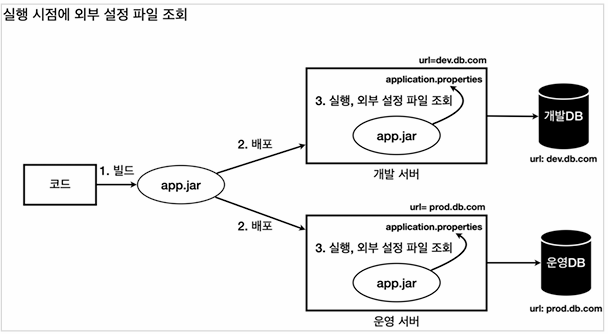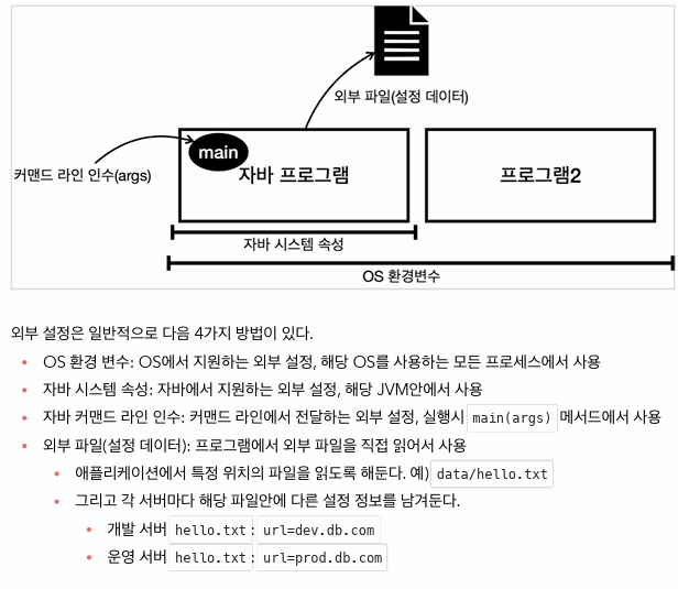 같은 코드에서도 다른 변수를 주입하게 하려면, 코드 내에서 외부 파일을 읽어와 이걸 변수에 할당하는 방법이 있다. 그래서 외부 설정이라고 하는거고, 외부 파일을 읽어들여 사용한다. 위 처럼 크게 4가지 방법이 있다는데 3가지 방법을 알아볼거다.