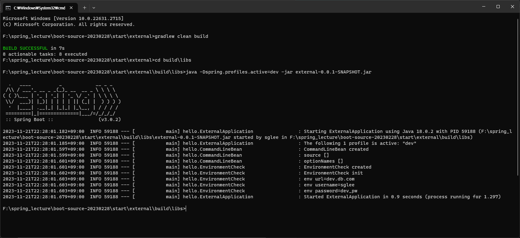 스프링이 커맨드 라인 옵션 뿐 아니라 자바 시스템 속성도 지원하기 때문에, 빌드한 뒤 나온 .jar 파일에서도 실행 가능하다.
