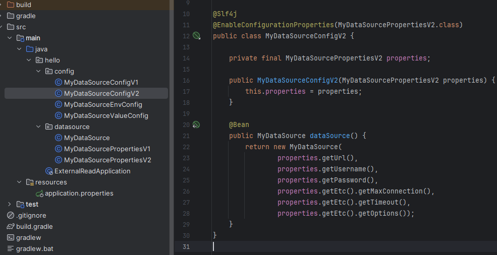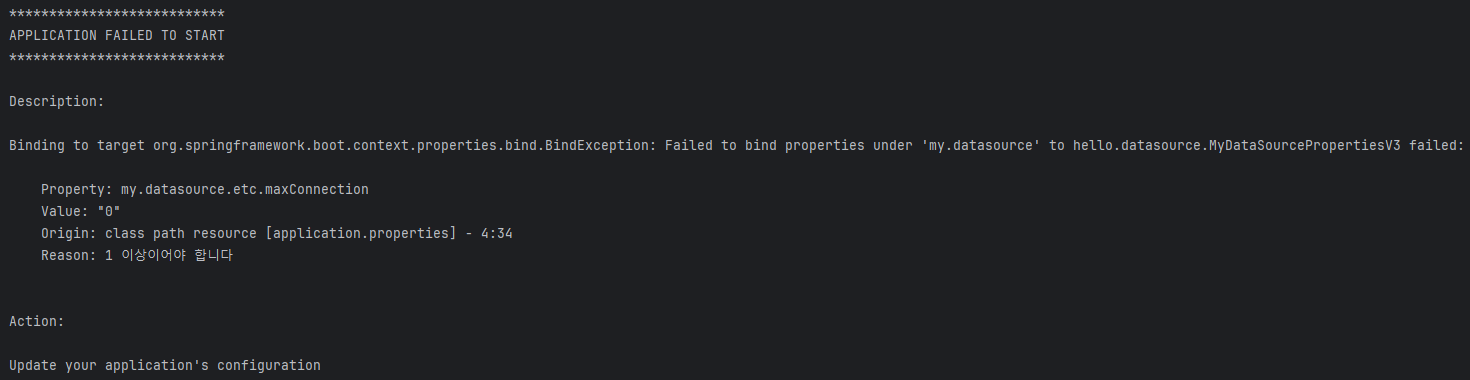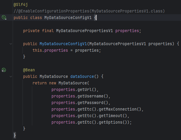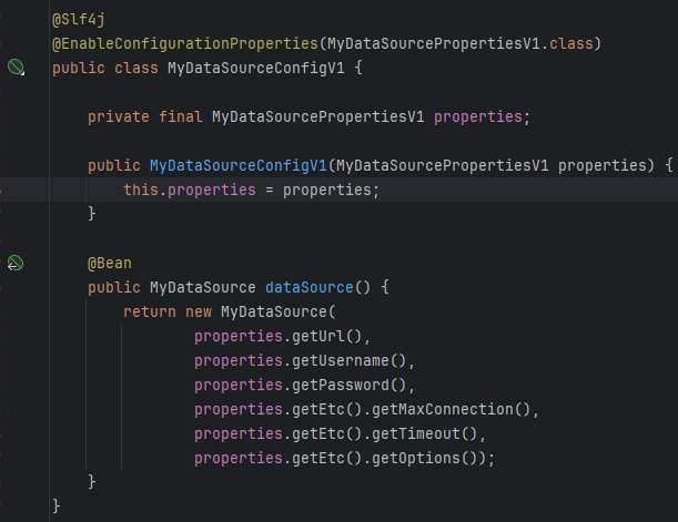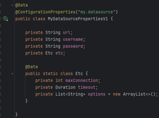 특징은 타입을 여기서 한번 체크해주기 때문에, 이 프로퍼티에서 나온 환경변수의 타입은 보장된다. 틀리게 매칭하면 에러뜸. 또 다른건 케밥표기법으로 max-connection으로 했는데 자바 코드 내에선 그냥 maxConnection으로 했는데도 매칭됨. 이는 스프링이 알아서 변환해주기 때문.