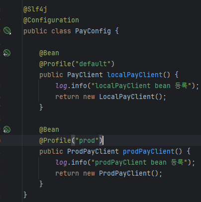 똑같은 서비스에서 실행하는데 config에서 @Profile에 따라 다른 bean을 등록하게 했기에 결과도 그에 따라서 나온다. 단 default는 진짜 아무것도 없을 때.