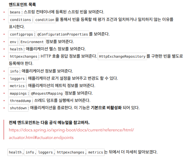 예를들어 어떤게 bean에 등록되었는지 어쩌구 저쩌구 ~~. 기본은 물론이고 확인 가능하다던지. 좀 스프링에 특화된 모니터링이다. 숨겨져 있을 뿐 기본적으로 shutdown을 제외한 대부분의 기능들은 활성화 되어있다.
