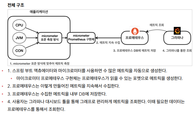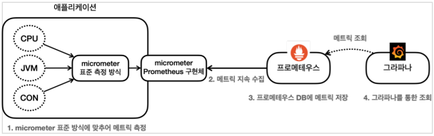 프로메테우스를 사용하기 위해 필요한 설정은 2가지인데, 프로메테우스가 받을 수 있는 형식을 줘야 하고, 프로메테우스에서 받은 형식을 주기적으로 긁어와 db에 저장해야 한다. 받을 수 있는 형식은 micrometer가 해줄거다.