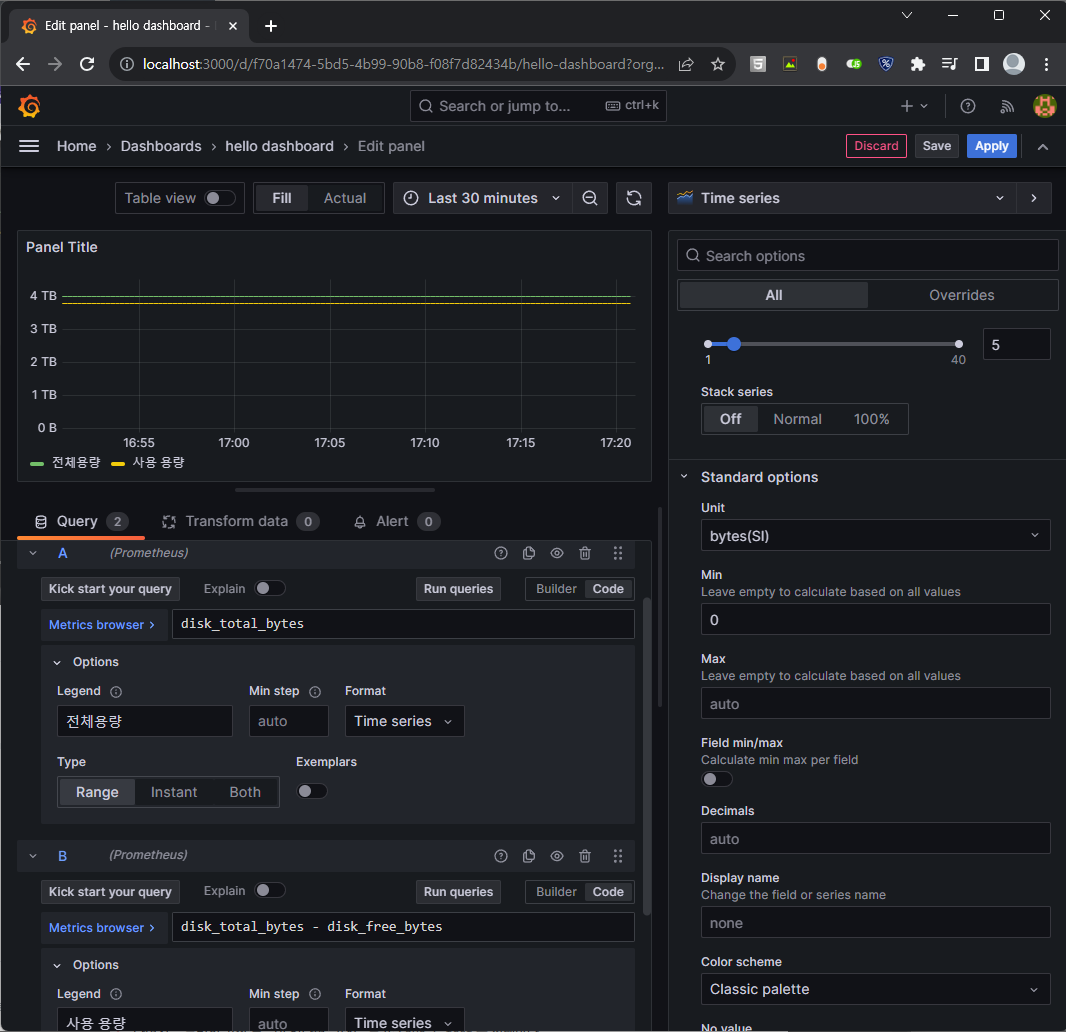 지표들끼리 뺄셈도 가능해서 사용 용량을 표시해봤고, 단위도 사람이 읽을수 있는.. SI로 변경했다.