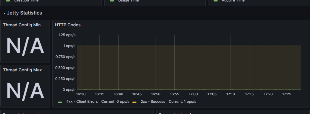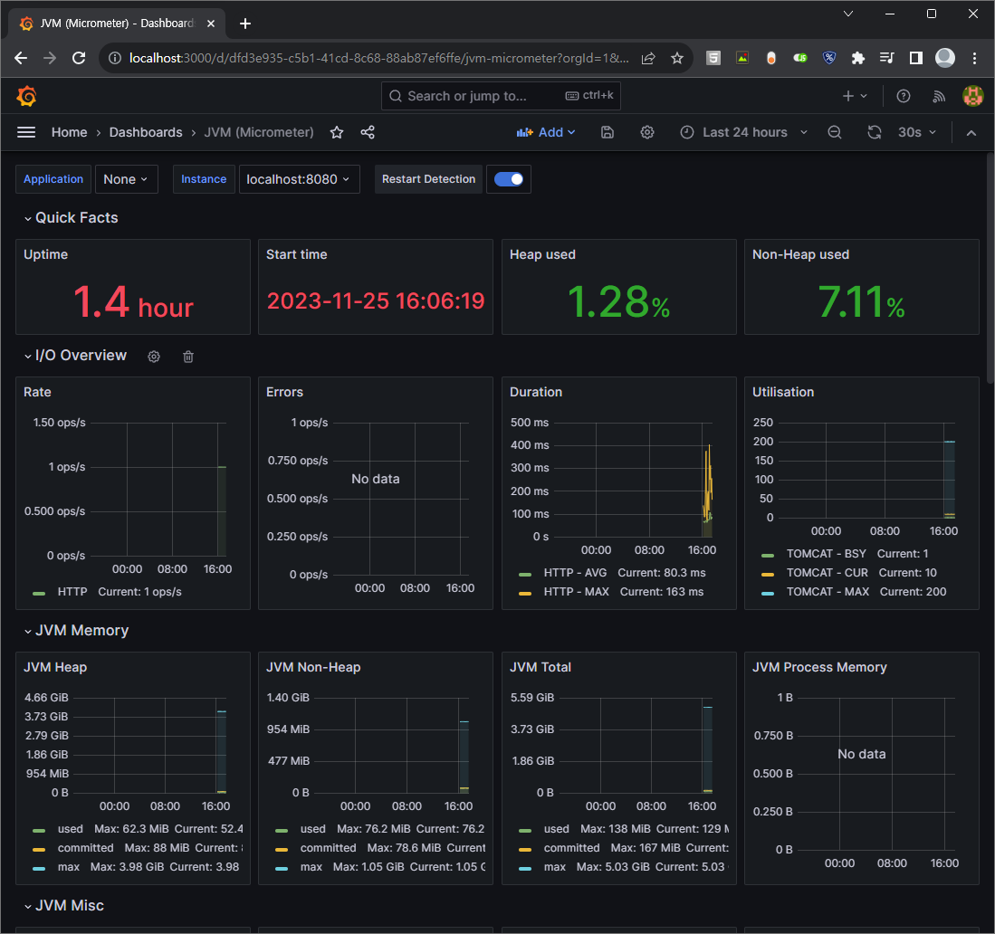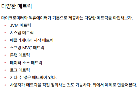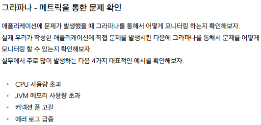 이런 cpu 사용량같은 os뿐 아니라 사용자 요청, 톰캣 쓰레드 갯수, 로그 등도 확인 가능하다. 특히 유용한건 tomcat.threads.busy, tomcat.threads.config.max 그리고 직접 사용자가 만드는 메트릭임. 사용자가 만드는건 실제 서비스로 사용하는 비즈니스 로직을 만들어 넣어 테스트해볼 수 있기 때문.