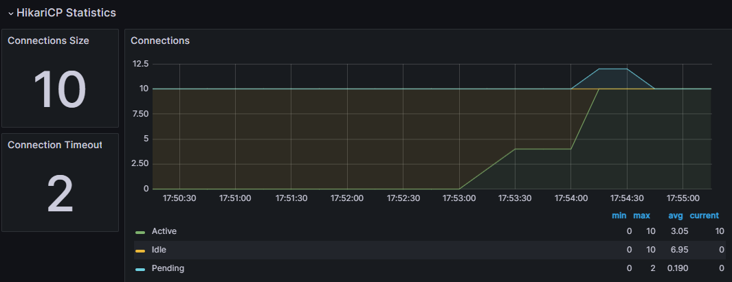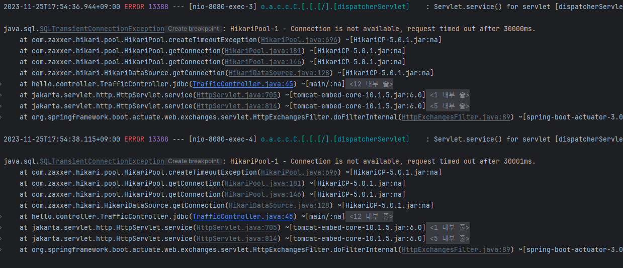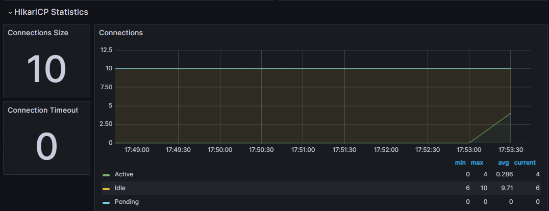커넥션을 안닫고 끝내니 쌓이다 끝내 pending으로 가고, pending된 요청은 30초 기다렸지만 끝내 못받아서 팅긴 모습이다. 이러면 큰일난거다. 요즘은 알아서 다 해주니 괜찮을 수 있지만 어쨌든 큰일난거는 변함없다.