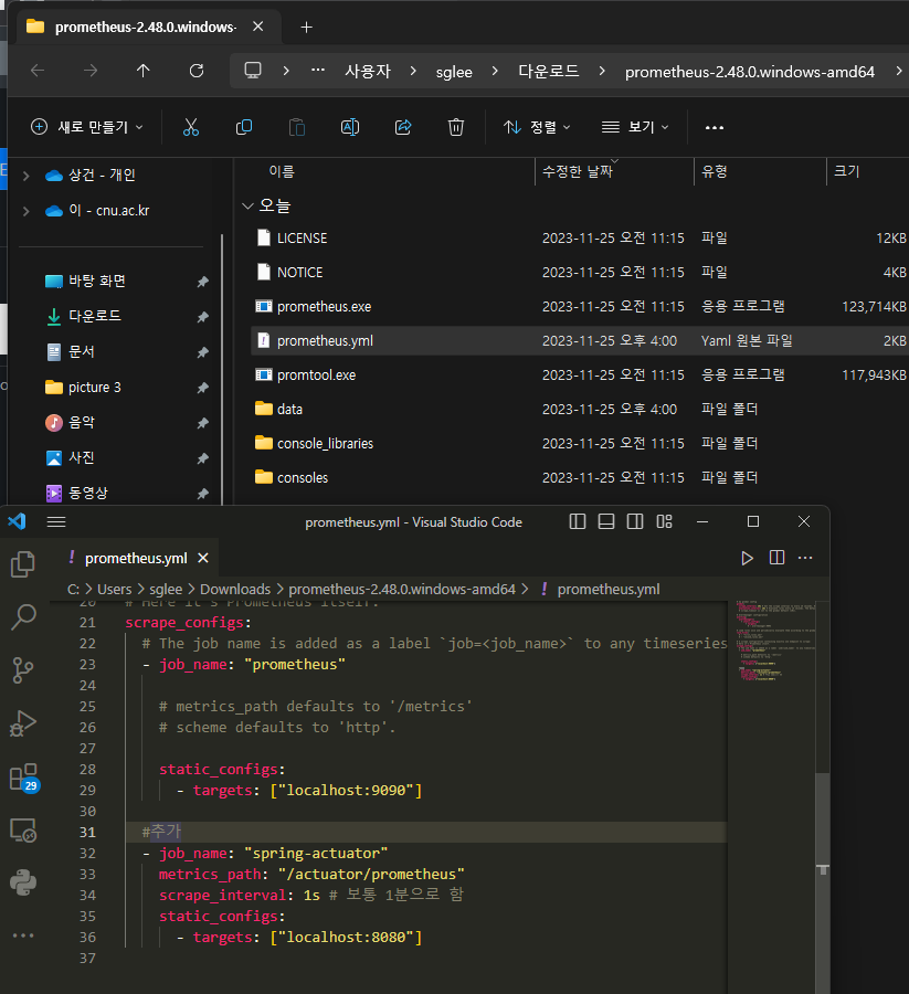 이제 수집하도록 설정할거다. 프로메테우스를 설치한 폴더에서 prometheus.yml를 수정하면 된다.