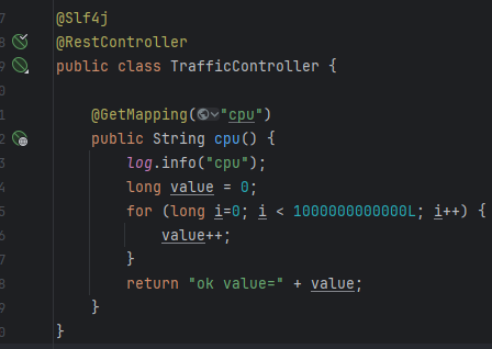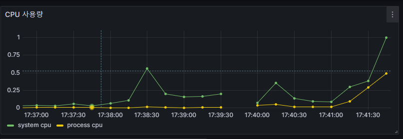 cpu에 과부화를 주는 코드 작성 후 여러번 요청 날리니 진짜로 올라간다.