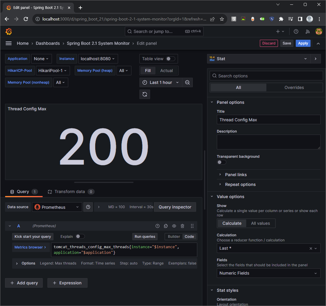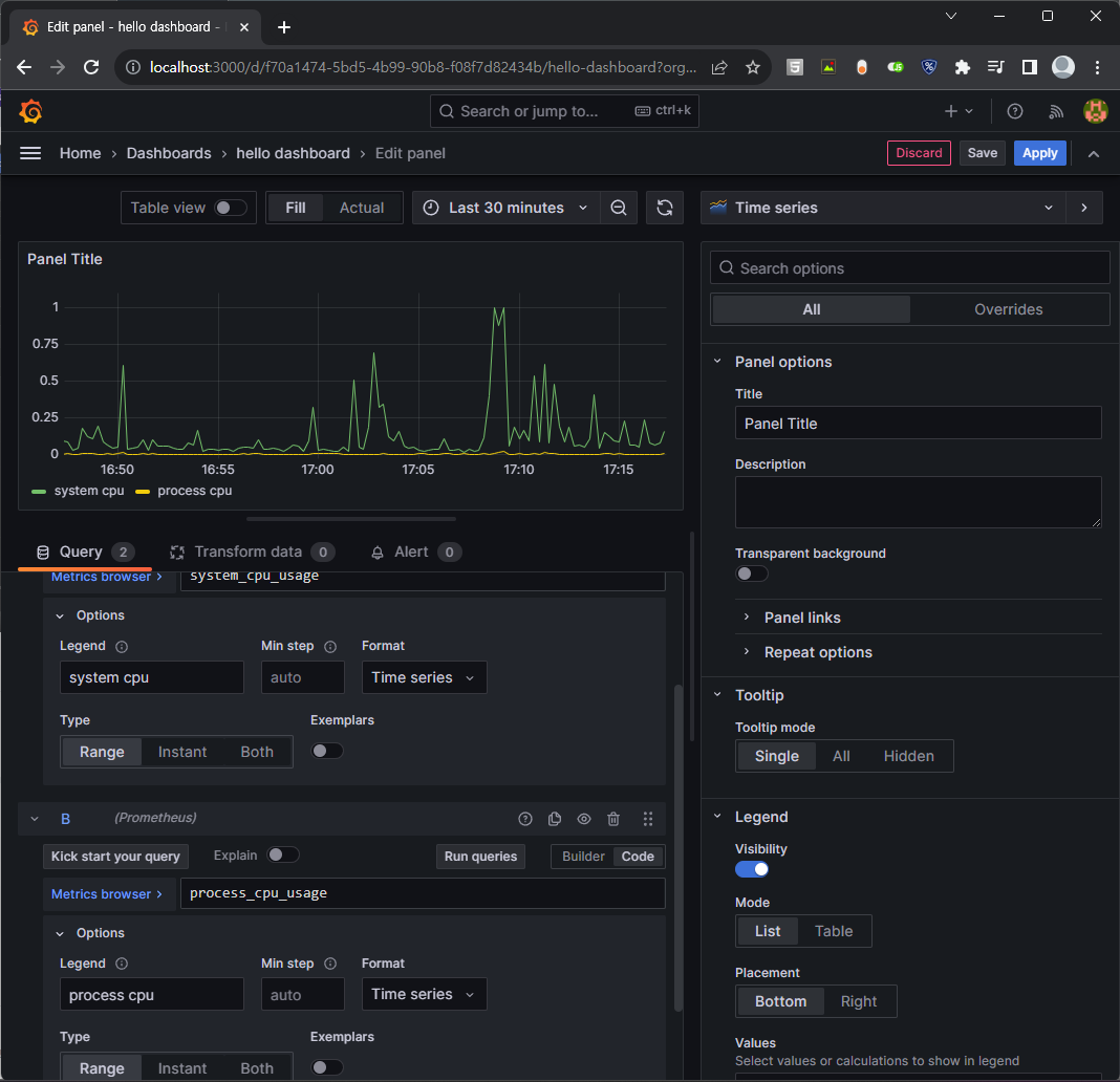 그 뒤 대시보드를 만들고 패널을 만든다. 여기 패널에서 query를 code로 바꾼 뒤 아까 프로메테우스에서 했던 명령어들을 입력하면 띄워준다. 표시되는 이름 등도 변경 가능하다.