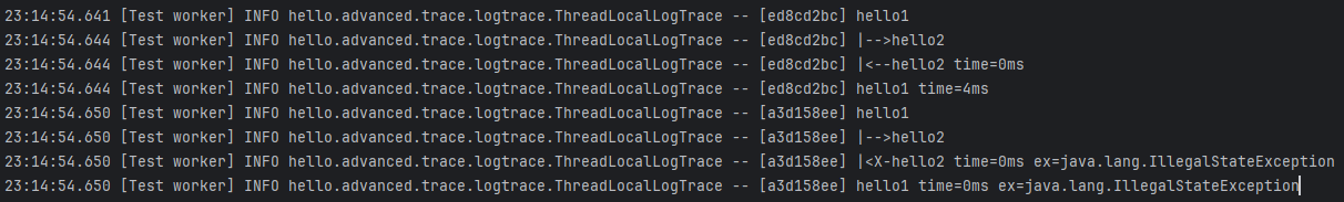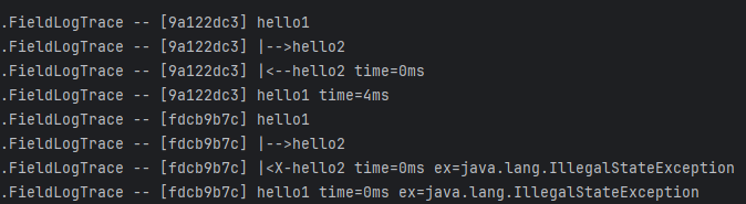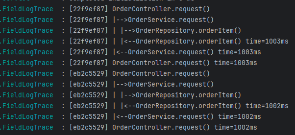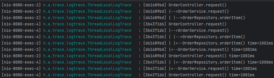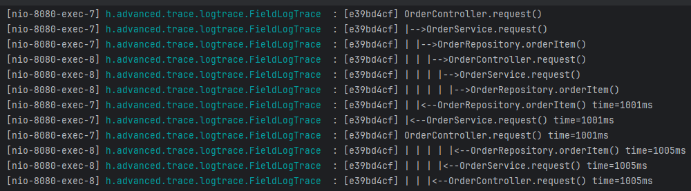사실 전과 거의 똑같지만, trace는 주입받아 하나의 인스턴스만 있다는 점을 이용, 처음부터 시작하면 TraceId를 가지고 있고 더 들어가면 그대로 +1하고.. 하는 작업을 한다.