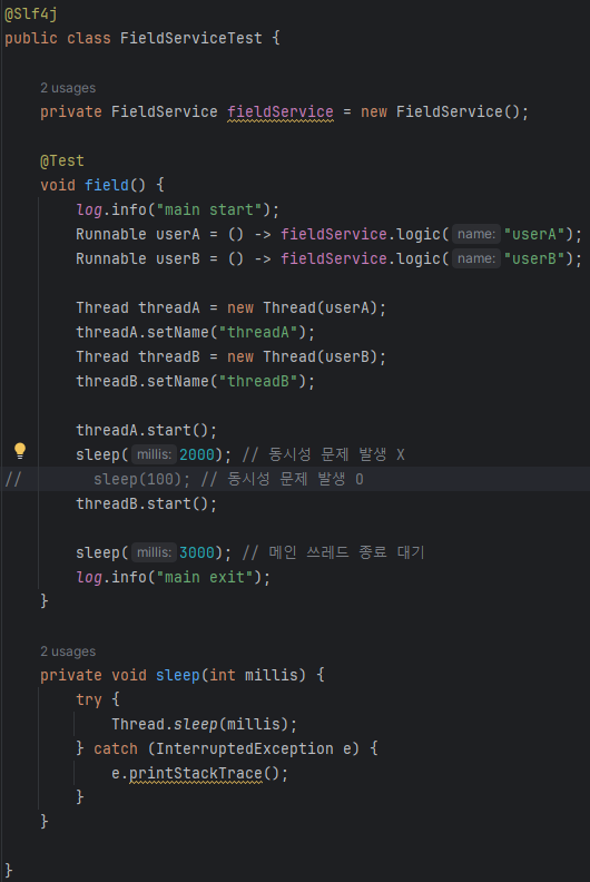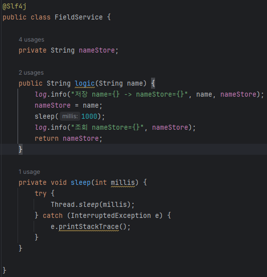 차라리 지역변수면 쓰레드마다 로컬 변수가 달라서 문제가 안발생할텐데, 싱글톤으로써 하나만 사용하는 인스턴스에 멤버변수를 변경하니 생기는 문제이다. 그렇다고 이것 때문에 스프링 빈에 등록해서 잘 쓰는 방식을 다시 파라미터를 받는 방식으로 다시 바꿀 수도 없고..