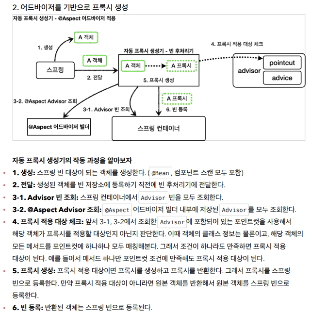 별 설정없이 @Aspect만 했는데도 된 이유가 위의 @Around가 포인트컷의 역할을 하고, 그 밑의 함수가 어드바이스의 역할을 하기 때문. 처음에 컴포넌트 스캔할 때 @Aspect가 붙어있으면 이걸 기반으로 어드바이저 빌더가 어드바이저를 생성해서 프록시를 만든다.