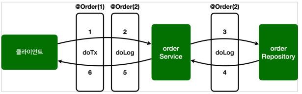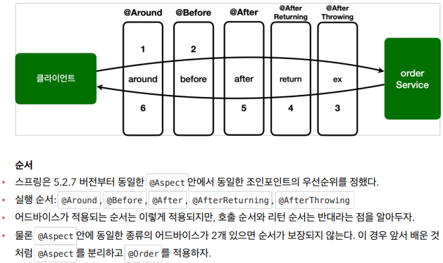 @Aspect는 순서를 보장하지 않아 순서를 @Order로 정해줘야 하는데 @Order가 함수 단위가 아닌 클래스 단위로 된다는 것이다. 그래서 불편하지만 클래스를 따로 만들어 @Aspect를 각각 해줘야 한다.