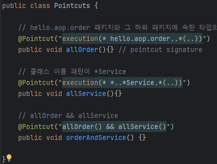 @Before("hello.aop.order.aop.Pointcuts.orderAndService()")