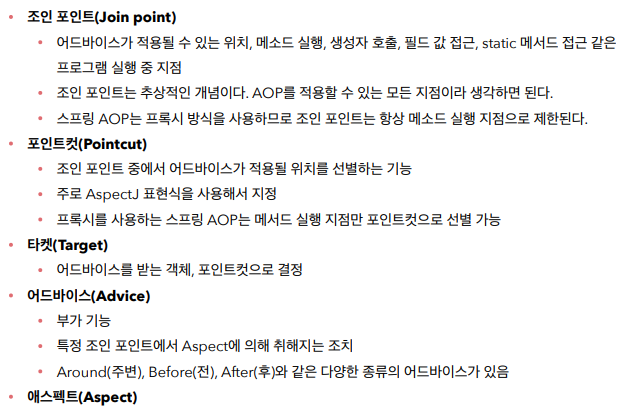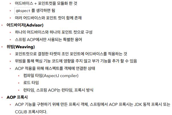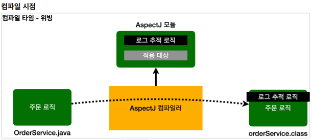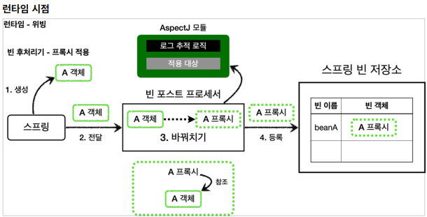 프레임워크라 원래 클래스를 프록시로 바꿀 수 있는 구간을 조인포인트라고 하는데 컴파일 시점에, 클래스 로딩 시점에, 런타임 시점(프록시)에 3가지 구간이 있다. 다 장단점이 있네마네 하는데.. 어차피 런타임만 사용할 수 있는 스프링 AOP만 해도 대부분의 문제가 해결되서 이것만 쓸듯. 이 런타임 시점의 단점은 프록시라 메서드 오버라이딩 개념으로 실행되서 막 생성자까지 할 수 있는 컴파일 시점처럼 안된다는 것. 근데 쉽고 활용성 높은게 장땡이다. 지금까지 써본건 런타임 시점임.