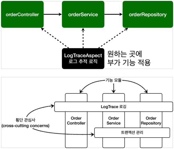 지금 문제가 뭐냐면 실제로 비즈니스 기능을 수행하는 핵심 기능과 로그를 남기는 부가 기능으로 나누는데, 이런 부가 기능은 대체로 여러 클래스에서 쓰일 확률이 높다.