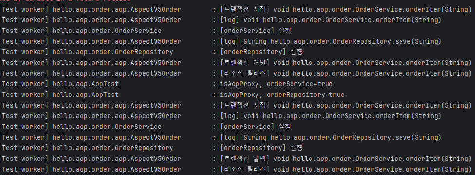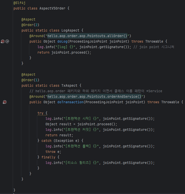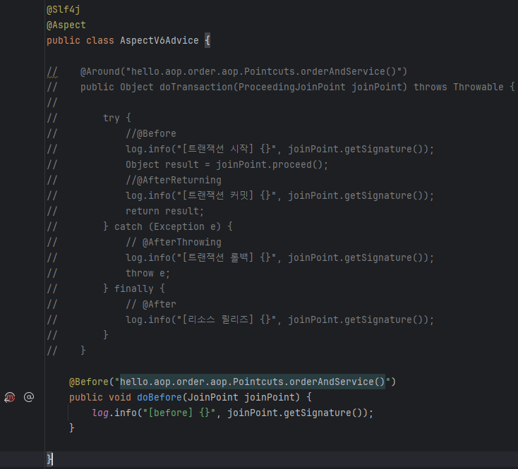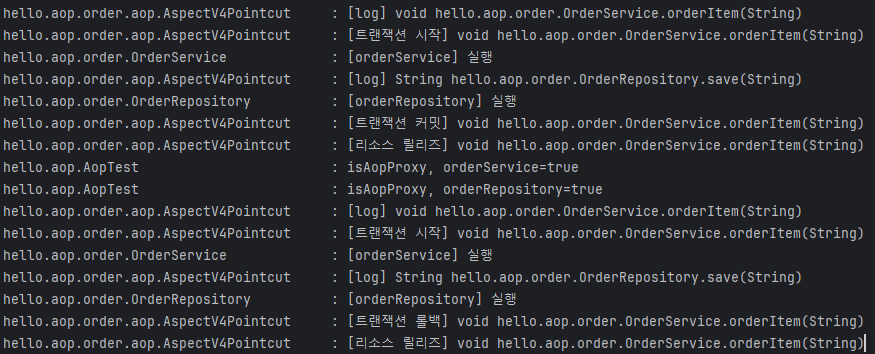 이 실행 순서를 바꿀 수도 있지만 그 전에 포인트컷을 외부로 빼서 사용하는 방법을 먼저 보자.