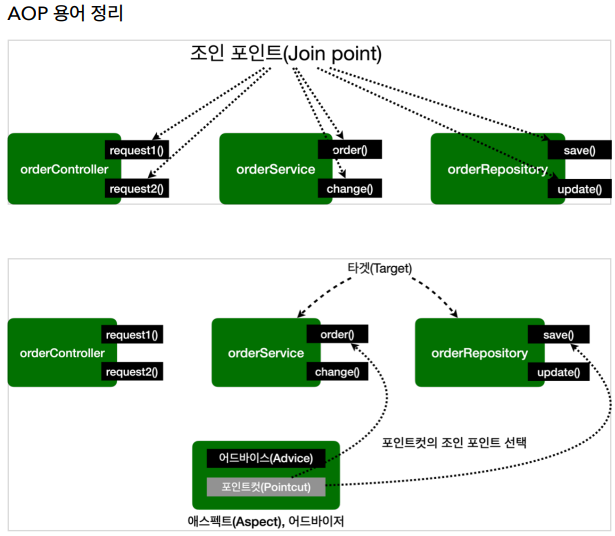 이걸 사용하기 위한 대표적인 프레임워크가 AspectJ인데, 스프링의 AOP가 이 프레임워크의 문법을 차용했다(기능까지 가져온건 아님)