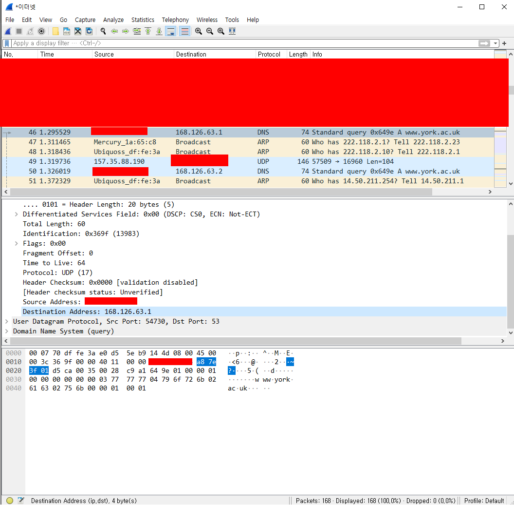 위 서버 ip가 168.126.63.1이라 wire shark에서도 168.126.63.1이 찍힌다.