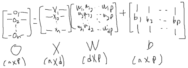 눈에 띄는건 데이터가 n개 있으니 결과 O도 n개이고, W의 p차원에 맞춰서 o의 결과도 p차원임.