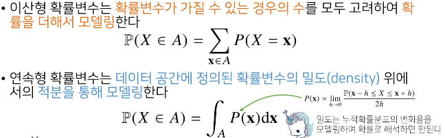 확률변수는 확률분포 D에 따라 이산형(discrete)과 연속형(continuous) 확률변수로 구분하게 된다. 시그마랑 적분으로 나뉜다고