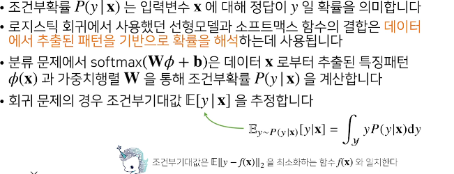 분류문제에서 softmax(Wpi + b)는 데이터 x로부터 추출된 특징패턴 pi(x)와 가중치행렬 W를 통해 조건부확률 P(y|X)를 계산한다. 즉 내가 구하고 싶은게 P(y|X) 이고 분류문제에선 softmax(Wpi + b) 를 이용해서 구할 수 있다는걸 뜻하는것 같다.