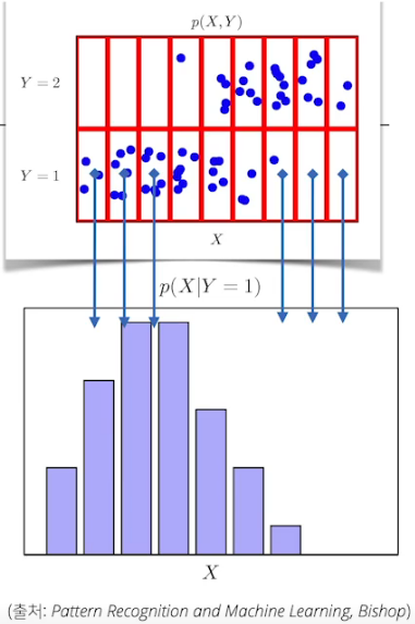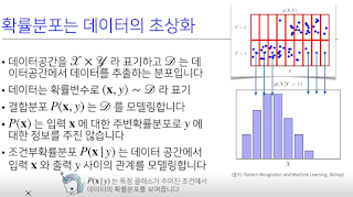 조건부확률로 안다는게 y가 1인 경우는 x가 어디 부근일때더라, x가 2이상인 경우엔 y=2가 많다더라~ 라는 식으로 안다는 거고. 저건 여러 데이터들을 discrete로 접근할 수 있다는 걸 알려주는 듯. 저렇게 크기를 정의해 놔야 분석을 하든 뭘 하든 할 수 있으니. 전 시간에 배웠던 거에선 저 데이터 다 계산해서 행렬로 푼 방법들 연립방적식이나 선형회귀분석으로 풀거나 경사하강법을 그것도 일부만 빼내서 확률적 경사하강법을 쓰던지 할 텐데, 조건부 확률을 사용하는 식으로 확률적으로 접근해서 풀기도 한다. 결국 모두 목적은 입력값 X와 출력값 y 사이의 관계를 모델링 한다. 즉 weight를 알아낸다고.