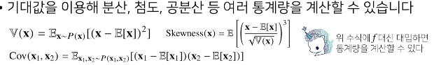 기대값 뭔지 알지? 이걸 이용해 분산, 첨도, 공분산등 여러 통계량 계산 가능 그래서 기대값은 굉장히 중요한 통계량이면서 도구다.