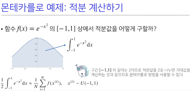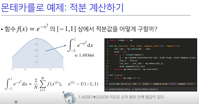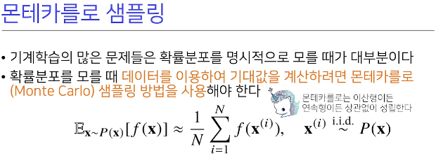 기계학습은 명시적으로 확률분포를 모를때가 많다. 그래서 몬테카를로 샘플링 방식으로 데이터를 이용해서 우회적으로 계산한다. 반복적으로 구하면 분산도 구할 수 있어서 오차범위도 계산 가능하다. 근데 데이터로 추정하는거라 수가 너무 적거나 하면 오차범위가 너무 넓어짐..