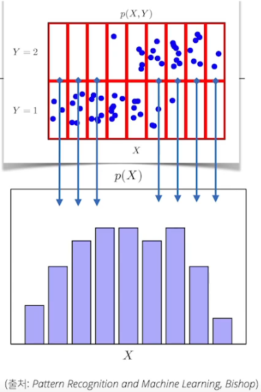 점들의 개수에 따른 확률분포. 주변확률분포. 걍 X 구간 안에 있는 모든 y개를 더하고(또는 적분) 나온 결과.