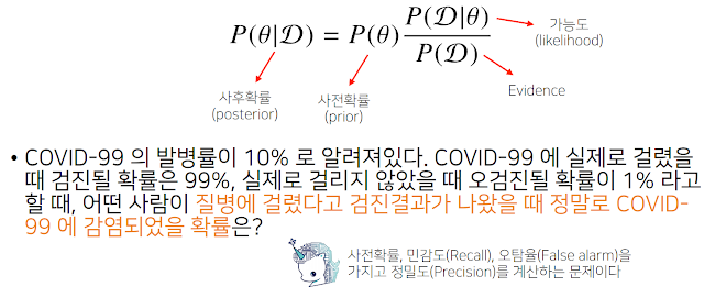 P(theta|D) 질병에 걸렸다고 검진결과가 나왔을 때 진짜로 감염되었을 확률. 질병에 걸렸을 때 걸렸다고 확진판정이 날 확률. 정밀도.