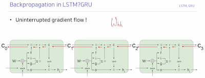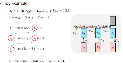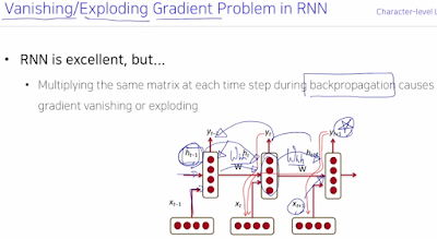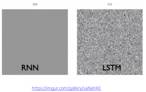 RNN 의 문제라면 계속 같은 W를 곱해주기 때문에 weight 값이 폭발하거나 사라지는 현상이 생긴다. 왜 그러나면 앞의 계수가 1 이 넘으면 계속 곱해주다 보니 폭발하고 1보다 작으면 사라진다. 위 그림에서 h3의 경우 h1에 대한 편미분을 하려고 보면 앞에 붙어있는 3을 계속 곱한걸 계산하게 되고 결과적으로 엄청커짐. 그래서 LSTM을 쓴다. 계수가 절대값 1 미만일때 밑의 그림을 보면 RNN은 금방 vanishing 되지만 LSTM은 오랫동안 살아있음.