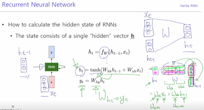 W는 t와 관계없이 어디에서나 같다. 입력인 xt와 ht-1 을 한 벡터로 연결하고 그걸 계산하는 W 로 생각할 수도 있고 나눠서 생각할 수도 있다. 현재 t 시간에서 출력값이 필요할 경우 W(hy)로 출력값 yt 만들 수 있음.