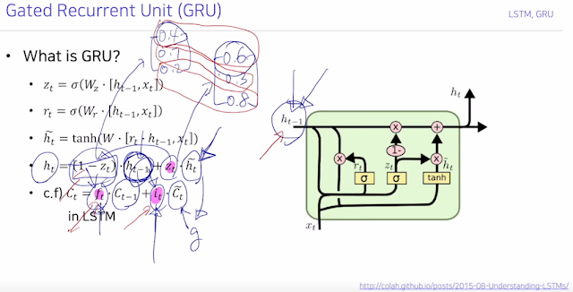GRU는 위 LSTM의 단점인 메모리를 많이 먹는 것과 계산할게 많다는 점을 보완하기 위해 나온 것. Ct와 ht를 그냥 ht로 합치고 LSTM에서 Input gate와 Forget gate를 하나의 zt 값으로 만들어서 계산한다. 확실히 가볍고 빠르긴 한데 LSTM보다 잘 될때도 있고, 안될때도 있다고 한다.