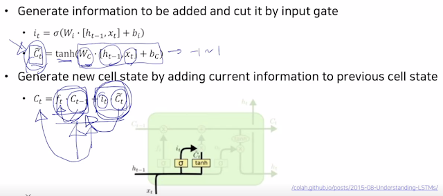 xt와 ht-1을 받아 ht가 나온 vanilla RNN 과 달리 xt, Ct-1, ht-1 을 받아 Ct 와 ht를 내놓는다.