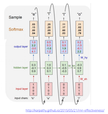 이런식으로 피드백모델. 위에서 입력 "h"의 경우 target은 "e"지만 결과는 "o" 가 나온걸 알 수 있다. 그래서 loss func을 "e" 가 나오도록 잘 정의해야겠지.