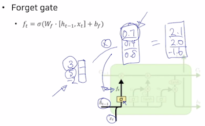 Forget gate는 가지고 있던 ht-1에서 xt와 결합해 softmax로 0~1 값을 가지게 한다. 그래서 나온 gate 결과와 ht-1를 곱해서 나온 값으로 어느 값을 얼마나 잊어버릴 지 정한다.