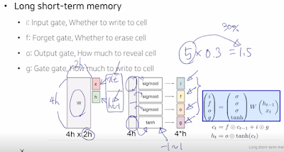 만약 x, h 둘다 크기가 h라고 하면, 두개 다 이어붙이기 때문에 W 열은 2h가 되고, 4개의 필터를 사용할 거라 4h 크기의 행을 가지게 된다. 각각을 h 크기로 나눠 필터로 사용할 거다. 그래서 필터는 Input gate, Forget gate, Output gate, Gate gate 4개가 있는데, i, f, o는 sigmoid를 사용해서 0~1의 값을 가지고 g는 tanh 를 사용해 -1~1의 값을 가진다. 그래서i, f, o는 얼마나 값을 가지고 갈지 배율을 통해 결정하고, g는 tanh를 사용하는게 RNN에서 선형 hidden state를 사용해 -1~1의 값을 가지게 해서 의미를 가져서 유의미한 정보를 가지게 해서 사용하는 것 같다.