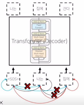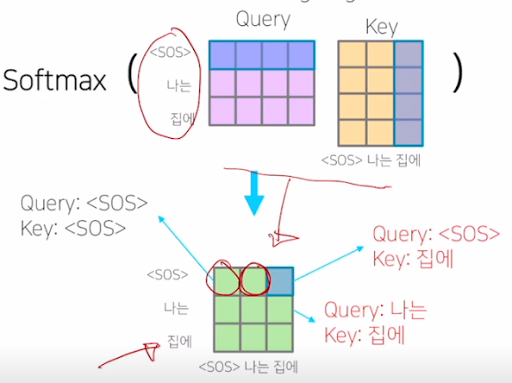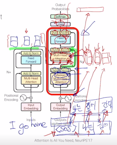 그리고 "I go home"을 "나는 집에 간다" 로 번역할 때 마지막에 linear를 거치는데 여기서 모든 한글 단어에 대해 linear을 펼쳐서 본다. 만약 한글 사전에 단어가 10만개 있으면 10만개 output을 내놓도록 linear에서 펼쳐놓고 softmax해서 가장 가능성이 높은 걸 출력한다.