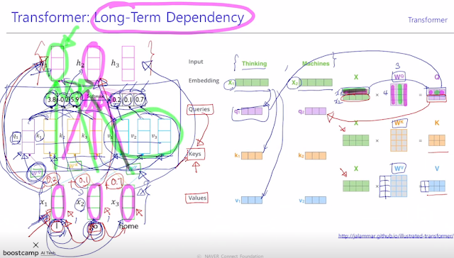 가중치결정 query. query 벡터와 곱해지는 재료 벡터 keys, 어느것을 가져올지. 또다른 재료역할 values 벡터