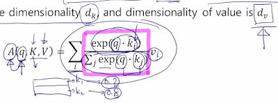A(q,K,V)는 values 벡터에 대한 가중평균. quary를 attention model 을 통해 encoding 한 벡터는 최종적으로 dv 차원 만큼이 나옴.