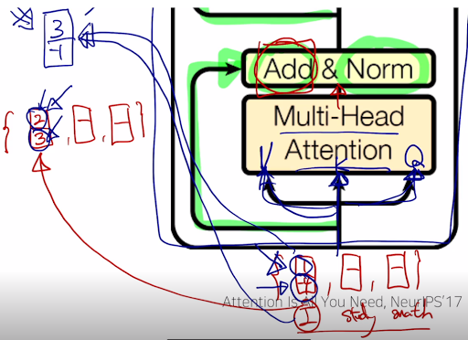 지금까지는 multi-head attention 을 본거고, transformer에서는 이 multi-head attention을 덧붙혀서 추가적인 후처리. residual connection. gradient의 vanishing 문제를 해결하여 layer를 여러개 쌓아 올려 성능을 올리겠다. 그럼 add와 Norm을 왜 하는가? 밑에 설명할거다.
