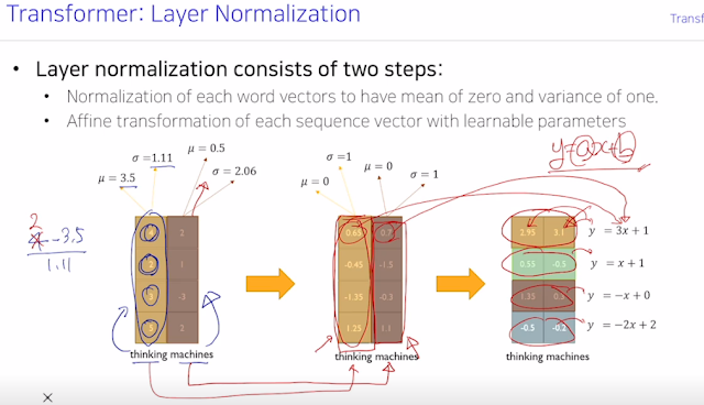 보면 thinking과 machines 단어를 넣었을 때 나온 hidden state를 정규화 해주고 내가 원하는 평균과 분산 값을 Affine transformation을 통해 주입하는 걸 볼 수 있다. 이게 layer normalization. batch normalization은 조금 다르다고 하지만 대강 비슷하다고 함.