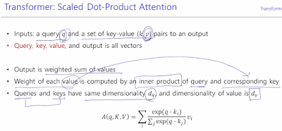 A(q,K,V)는 values 벡터에 대한 가중평균. quary를 attention model 을 통해 encoding 한 벡터는 최종적으로 dv 차원 만큼이 나옴.