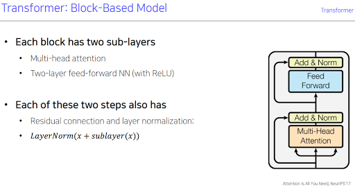 한 block을 구성하는 Multi-Head Attention, residual connection, Layer Normalization. Feed Forward는 fully connected layer. Transformer에서 제안한 self-attention인 Multi-Head Attention을 포함한 한 블럭.