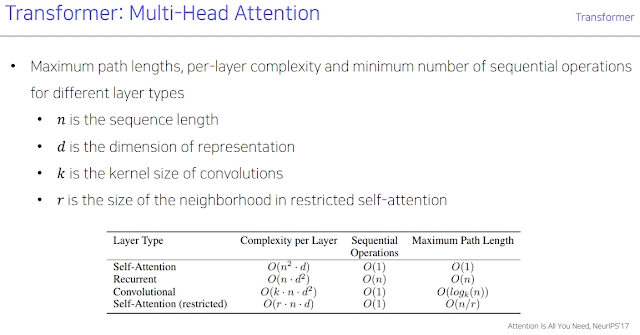 우리가 한 Self-Attention의 경우 입력길이, k차원 길이가 행렬곱셈 정의에 의해 O(n^2*d) 가 된다. 하지만 이것은 병렬처리가 가능하기 때문에 병렬처리의 시간복잡도 Sequential Operations는 1이 됨. 단어와의 길이도 매번마다 query vector 와 key vector를 각 단어마다 계산해서 O(1)인듯.