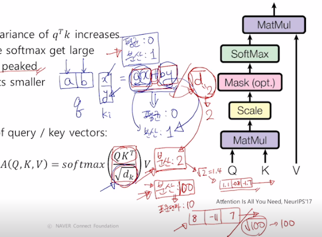 평균과 분산이 있으니까 두개를 더하게 되면 평균은 그대로 0이지만 분산은 늘어난다. 근데 이게 단순히 개수가 늘어나면 늘어나는 거기 때문에 k차원이 늘어나면 늘어날수록 더하는게 많아지고 그러면 분산도 더 커진다. 그래서 단순히 k차원이 늘어난다고 분산이 커지고, 분산이 커지면 굉장히 큰 값이 나오고 큰 값과 작은값의 차이가 softmax 에 상당한 영향을 주기 때문에 표준편차로 나눠서 정규화 하는 것. 즉 softmax 하기 전에 한번 정규화를 시켜줘서 k차원이 얼마나 크든 작던간에 상관없이 만들어 주는 거다.