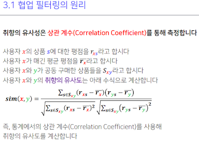 협업필터링 유사도식. 익숙한 형태. 상관계수 구하는거.