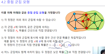 정점이 군집 A에 속해있다면, 같은 군집 A에 속해있는 다른 정점과 연결될 확률이 PA 라고 한다. 그러므로 두 정점이 여러 군집에 동시에 속해있을 경우, A군집이든 B군집이든 어쨋든 둘이 간선으로 연결되어있을 확률이 1-(1-PA)(1-PB) 라는 듯. 연결되어 있다면 군집으로 치니까.. 둘다 어디에도 안 속하면 그냥 엡실론의 낮은 확률로 직접 연결되자고 하는 것 같다.