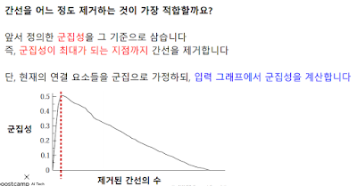 이런식으로 매개 중심성이 가장 많은 간선부터 하나씩 제거하며 군집성을 측정해 제일 높은걸 기준으로 삼는듯.