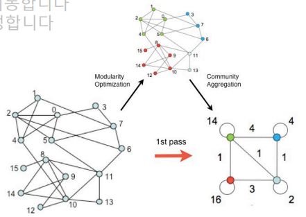 Louvain 알고리즘은 반대로 상향식(Bottom-Up) 군집 탐색 알고리즘이다.